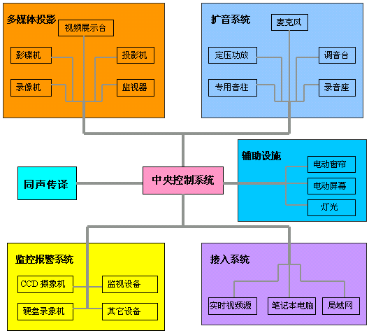 投影機從CRT三槍投射方式到現在的LCD單槍液晶投影及最新研制的DLP數碼投影機,雖然只經歷了短短的數年,但這項科技的發明卻給人們帶來了太多的方便與實惠。想象一下,在沒有大屏幕投影的年代,人們召開新產品演示發布會、大型公開教學、大型會議等都將停留在原始的說教方式,而不能很好地結合圖文播放以表達與會者的意圖。以投影方式區分,有正投、背投、組合拼接三種方式。正投又分為吊裝、坐裝兩種,其優點是場地利用率高、安裝簡單。背投方式抗環境光線干擾能力強,氣派、美觀,缺點是要求場所要有足夠的縱深。組合拼接是目前大幅面投影方式的首選,廣泛應用于電視臺、交通指揮監控中心、報警中心、部隊等場合,其優點是亮度高、畫面組合方式靈活、屏幕尺寸大,但同時需要有足夠的投資。 音響系統 音響系統在會議、教學場合有著舉足輕重的地位,音響效果的好壞甚至決定一場會議或一堂教學的成功與否。音響主要包括功放、主音箱、中置音箱、環繞音箱、定位音箱等部分組成,實現功能可分為擴音、伴音、現場音效、環繞,不同配置及不同檔次的音響設備將營造出完全不同的效果,因此在具體配置時一定要根據現場環境的要求,結合實際所需,通過咨詢專業音響人士給出一套真正實用、完美的音響系統。 多媒體周邊設備 現代會議需要多種視頻信號及現場環境調控,如要播放一些產品演示光碟、錄像帶這就需要DVD和錄像機,如現場環境調控所需的調光燈、日光燈及電動窗簾等。我們把以上設備統稱為多媒體周邊設備。下面列舉一些我們現代會議必需的一些多媒體周邊設備及其功能: DVD 播放高密光盤,提供高質量的視音頻信號源。 錄像機 播放錄像帶,提供視音頻信號源。 視頻展示臺 將現場實物轉換成視頻信號,在顯示設備上播出。 磁帶卡座 播放磁帶的音頻信號及會議現場錄音。 電視 接收電視射頻信號及各種視頻播放的信號。同類設備有背投電視、等離子顯示器等。 計算機 演示計算機軟件及其產品。 投影機 通過投影方式,播放以上一些設備源所輸入的視頻信號。 電子白板 使用就像用黑板一樣方便,但可即時把所書寫的內容通過白板自帶的打印機打印出來。 電動屏幕 配合投影機使用,以便得到高質量的大幅面圖像。 現場燈光 配合會議進行現場環境調控。 電動窗簾 配合會議進行現場環境調控。 中央控制系統 現代化的會議場所集合了電腦及多種視音頻輸入輸出設備,操作者需要對每個設備實現控制,還要完成設備間的信號切換,使之在一個或多個演播設備中播出,同時現代化的會議對燈光、電動屏幕及窗簾的配合控制也是必不可少的要求。針對以上問題,中央控制系統是最佳解決方案,操作者通過直觀的控制界面操作,將復雜的會議設備操作及環境控制變得輕松自如。 如何化繁瑣為簡單呢?把它交給中央控制系統! 中央控制系統以其創新的設計,精亦求精的態度,處處以用戶角度去開發各種新產品。輕松控制所有視音頻設備如音響、電器、投影等,實現全局燈光、窗簾等環境的設定。 中央控制系統在以下場所大量使用: 企業、機關會議廳,全面控制所有的視音頻設備及環境設定; 大型多功能廳、階梯教室、發布會,對視音頻、大屏幕投影及燈光控制 展覽會、巡回演示,輕松演示各種設備功能、簡化操作; 博物館、紀念館,控制多媒體演示設備及燈光; 學校、培訓中心,控制多媒體設備電動屏幕、窗簾等; 居家自動化系統、家庭影院的全面控制; 報警控制中心、電力調度中心及摸擬系統培訓中心; 保安監控管理、控制電動防盜門、集中管理監視攝像的掃描、變焦 視像會議系統的攝像、訊號切換、環境控制; 大型體育館,控制視音頻、顯及各種機械設備的操作 | |